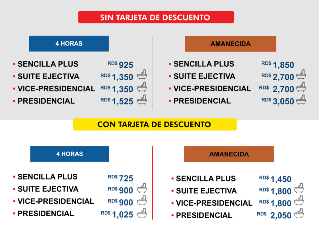 LISTADO DE PRECIOS HABITACIONES CON PSICINAS HABITACIONES HORARIO DE AMANECIDA: 9:00 PM A 9:00 AM Redes Sociales Contactos 809-570-7880 829-812-5815 Autop. Juan Pablo Duarte Km 6½, Santiago de los Caballeros, República Dominicana.